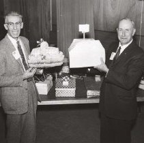 Healdsburg Rotary Club, Box Social, March 1960 Newspaper article affixed to rear of photo: "John Uboldi and N. E. Waltenspiel, judges, picked the winners at the Rotary Club's Box Social."