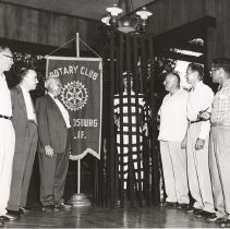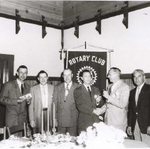Healdsburg Rotary Club, installation of new officers, June 1955 Left to right - Wayne Goodrich, Charles Johnson, N. E. Waltenspiel, Charles Weston, Don Lewis, Jack Quinby Newspaper article affixed to rear of photo, see image #2. See also similar photo, 88.2102.2